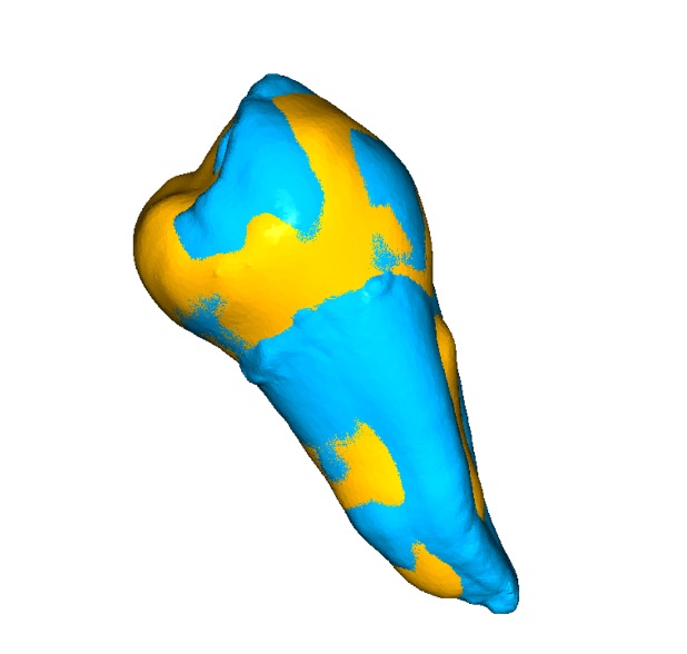 Figure 3. 3D rendering of the superimposed models, showing the Cephx3D v2 reconstruction (Gold) overlaid on the IOS ground truth model (Blue).